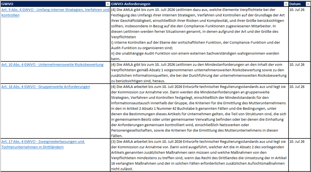 | Art. 26 Abs. 5 GWVO - Kontinuierliche Überwachung der Geschäftsbeziehung und Überwachung der Transaktionen von Kunden | (5) Die AMLA gibt bis zum 10. Juli 2026 Leitlinien für die kontinuierliche Überwachung einer Geschäftsbeziehung und die Überwachung der im Kontext dieser Beziehung durchgeführten Transaktionen aus. | 10. Juli 2026 |
